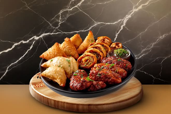 Sélection : samosas, oignons bajhi, seekh kabab et chicken tikka — idéal pour découvrir les saveurs.