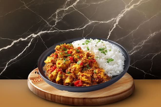 Sauce balti maison et épices fraîches avec protéine halal au choix accompagné de riz basmati — riche, chaude et parfumée.