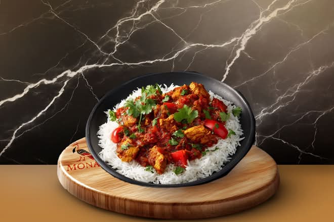 Sauce balti maison, poulet/agneau/crevettes halal frais mijotés accompagné de riz basmati — chaud, riche et savoureux.