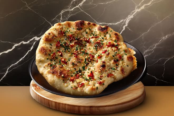 Pain naan aux piments et à l’ail — aromatique et généreux.