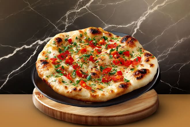 Pain naan pimenté, pâte levée — relevé et savoureux.