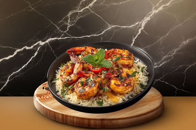 Gambas halal fraîches grillées aux oignons, poivrons et épices accompagné de riz basmati — gourmand et explosif.