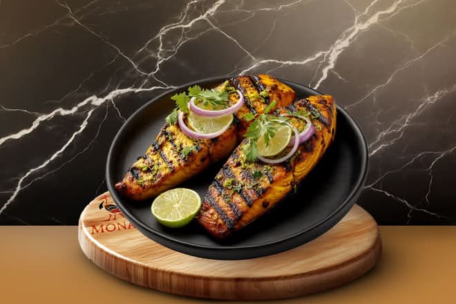 Saumon frais mariné et grillé au tandoor — fondant et délicatement épicé.