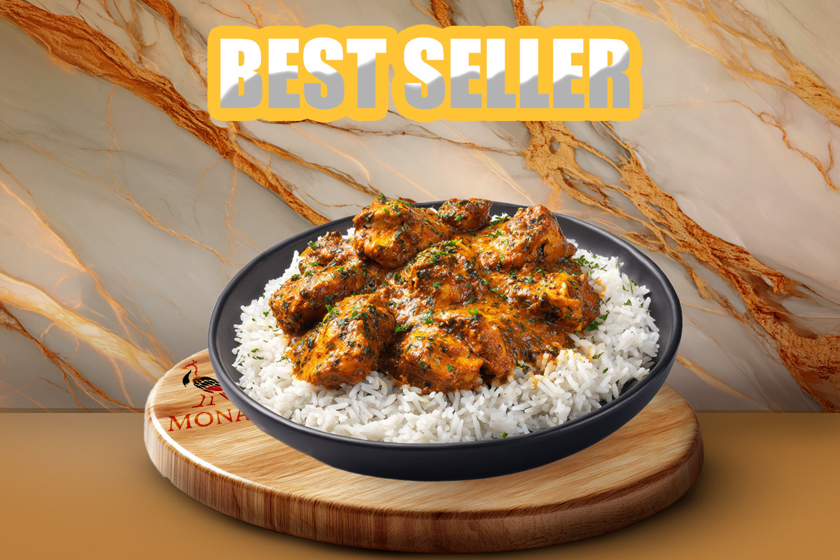 Sauce masala parfumée avec protéine halal fraîche grillée accompagné de riz basmati — onctueux et irrésistible.