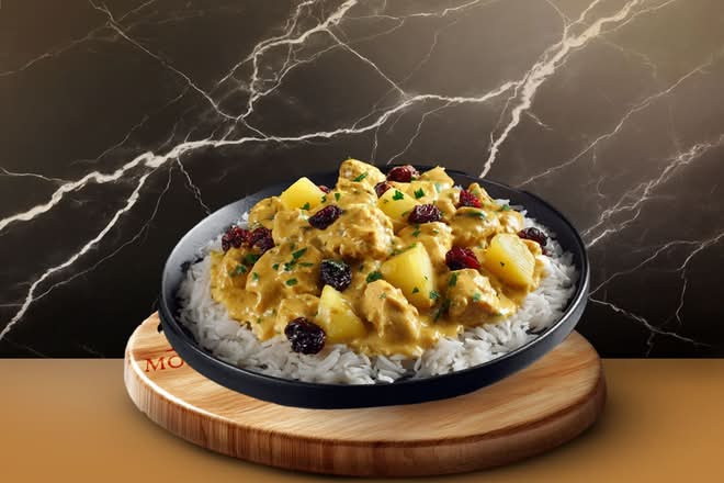 Protéine halal au choix. Sauce douce aux fruits secs et ananas accompagné de riz basmati — crémeux, fin et gourmand.